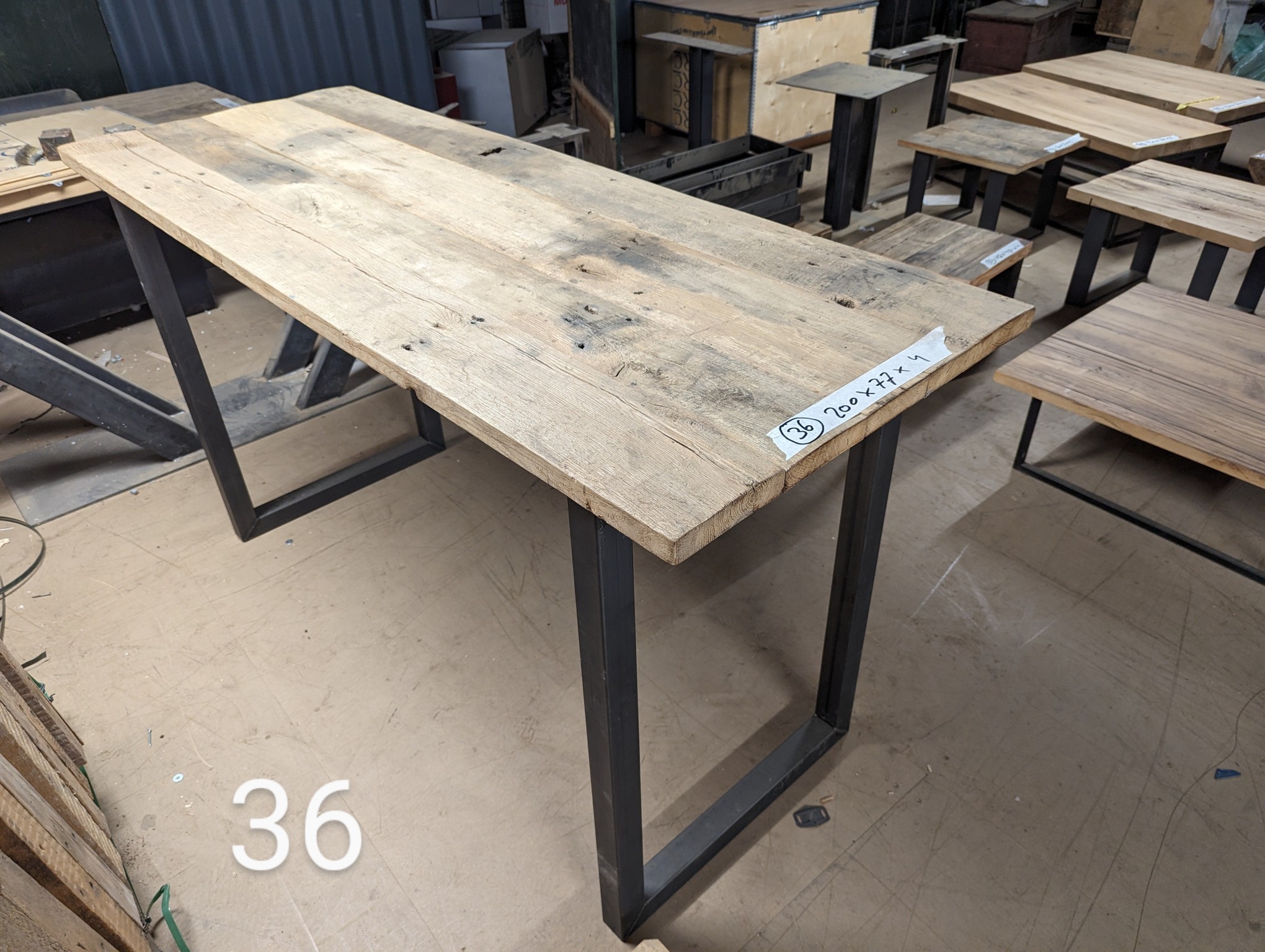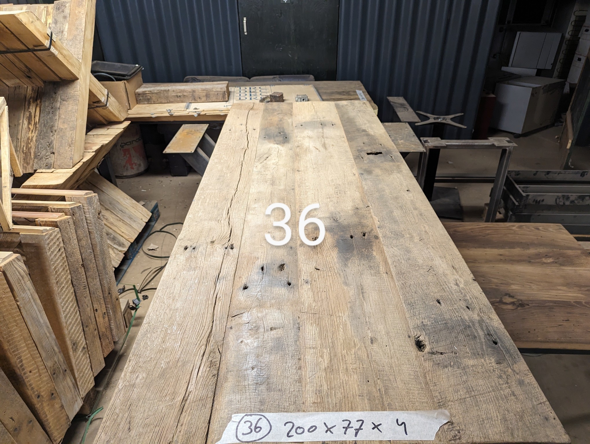Tafel oud eiken 130cm 4cm metaal spinpoot