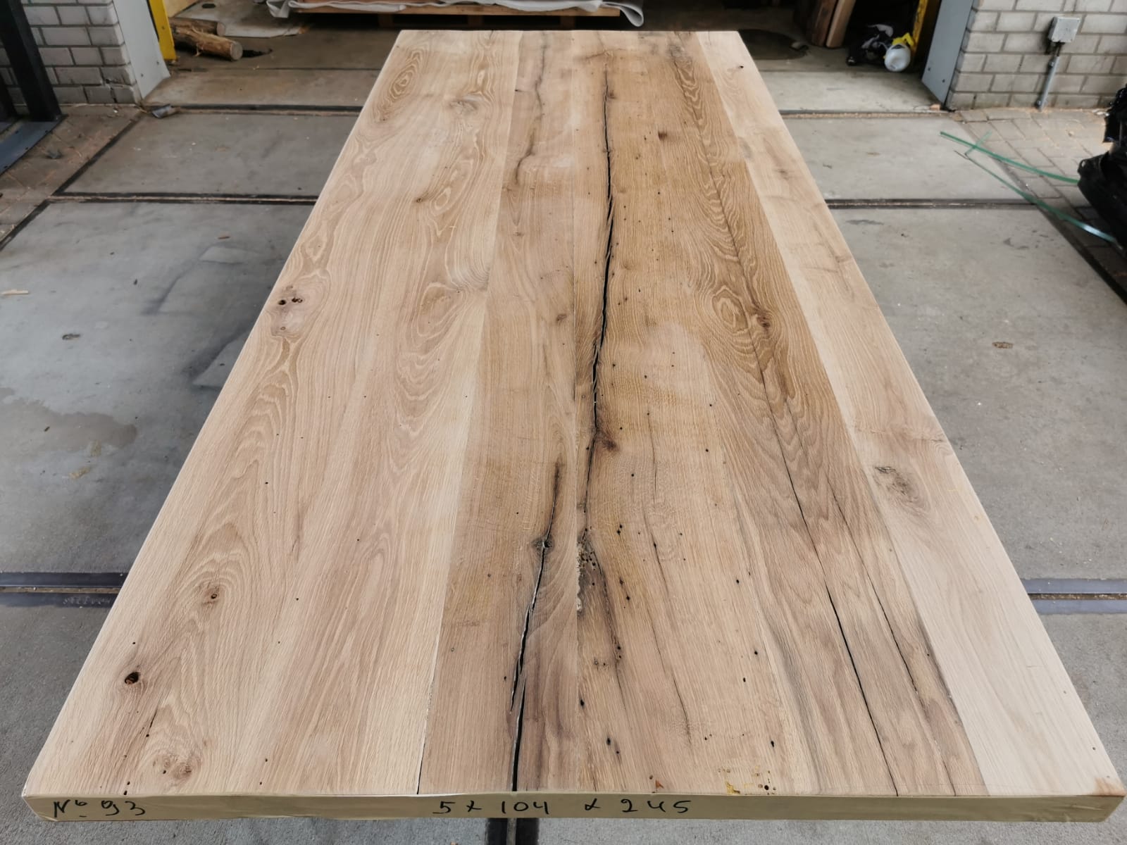 Geschaafd oud eiken 2,45 * 1,04 * 0,05 Tafelblad geschaafd oud eiken Vlakke structuur met een enkele scheur of diepe nerf Wat donkere accenten Kan op aanvraag worden gelakt Uitverkocht Artikelnummer: 93-6 Categorie: Uncategorized